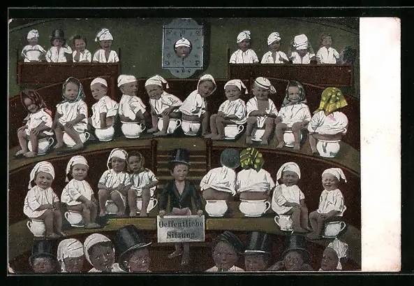 AK Kleine Kinder auf Töpfchen, Oeffentliche Sitzung
