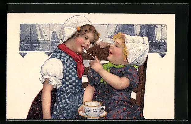 AK Kleine Mädchen trinken Tee in niederländischer Tracht
