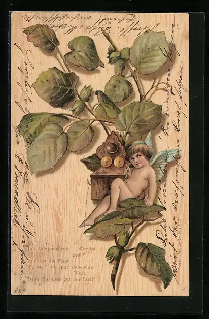 AK Kleiner Engel sitzt mit Telefon auf einem Zweig