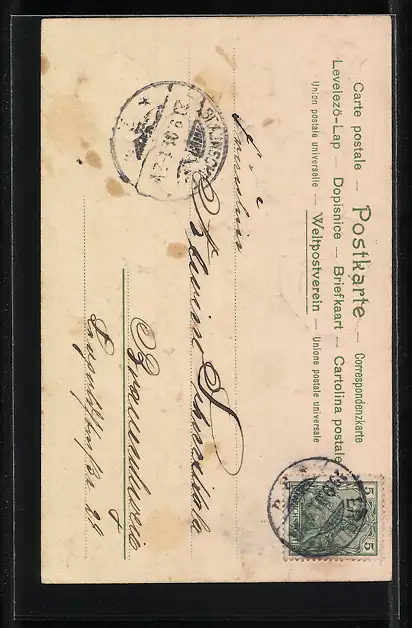 Personenbezogene Daten auf der Rückseite der Karte wurden durch blauen Textmarker unkenntlich gemacht. Die blauen Stellen sind auf die Vorderseite durchgeweicht und wirken sich negativ auf das Postkartenfoto aus