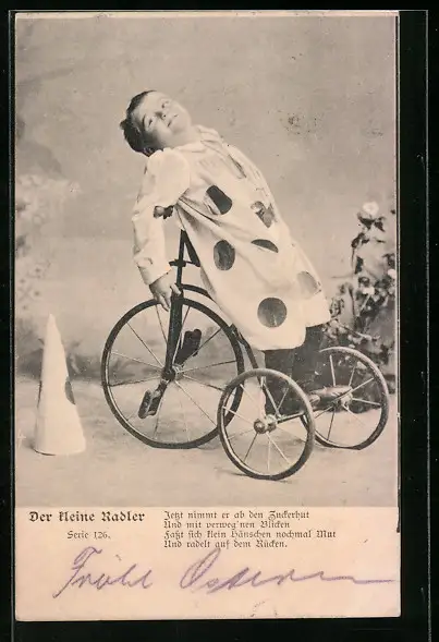 AK Kleiner Harlekin auf ein Dreirad gelehnt