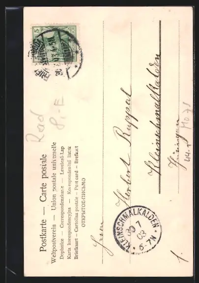 Personenbezogene Daten auf der Rückseite der Karte wurden durch blauen Textmarker unkenntlich gemacht. Die blauen Stellen sind auf die Vorderseite durchgeweicht und wirken sich negativ auf das Postkartenfoto aus