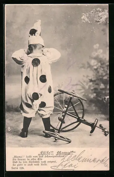AK Kleiner Harlekin mit umgekipptem Dreirad
