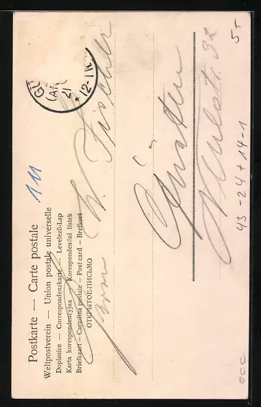 Personenbezogene Daten auf der Rückseite der Karte wurden durch blauen Textmarker unkenntlich gemacht. Die blauen Stellen sind auf die Vorderseite durchgeweicht und wirken sich negativ auf das Postkartenfoto aus