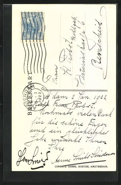 Personenbezogene Daten auf der Rückseite der Karte wurden durch blauen Textmarker unkenntlich gemacht. Die blauen Stellen sind auf die Vorderseite durchgeweicht und wirken sich negativ auf das Postkartenfoto aus