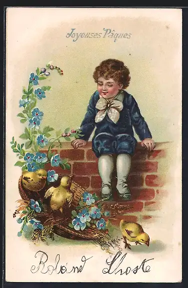 AK Kleiner Junge entdeckt Osterküken in einem Korb