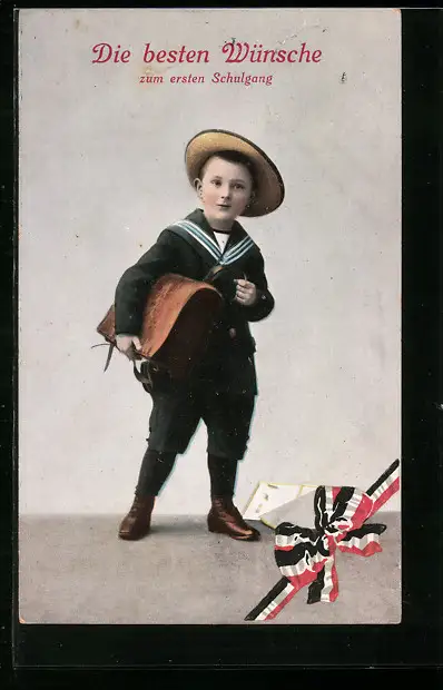 AK Kleiner Junge im Matrosen-Anzug mit Hut und Ranzen