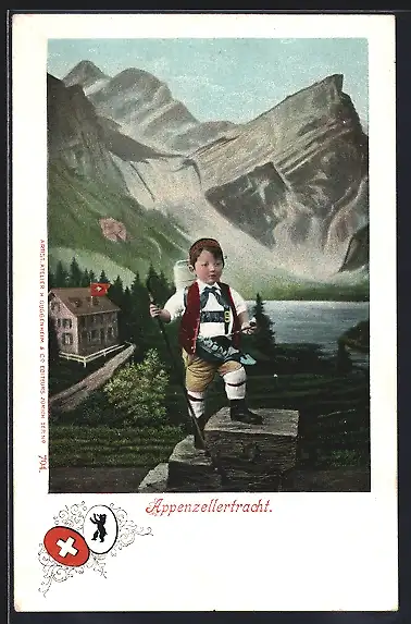 AK Kleiner Junge in Appenzeller Tracht mit Stock und Pfeife