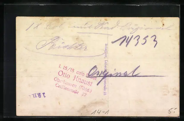 Personenbezogene Daten auf der Rückseite der Karte wurden durch blauen Textmarker unkenntlich gemacht. Die blauen Stellen sind auf die Vorderseite durchgeweicht und wirken sich negativ auf das Postkartenfoto aus