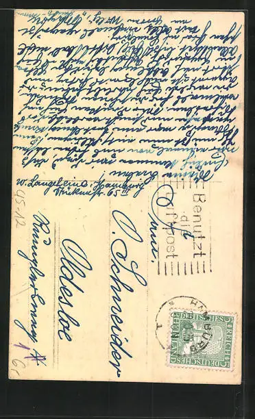 Personenbezogene Daten auf der Rückseite der Karte wurden durch blauen Textmarker unkenntlich gemacht. Die blauen Stellen sind auf die Vorderseite durchgeweicht und wirken sich negativ auf das Postkartenfoto aus