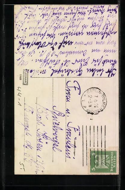 Personenbezogene Daten auf der Rückseite der Karte wurden durch blauen Textmarker unkenntlich gemacht. Die blauen Stellen sind auf die Vorderseite durchgeweicht und wirken sich negativ auf das Postkartenfoto aus