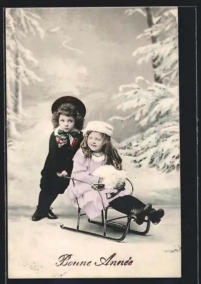 AK Kleiner Junge schiebt einen Schlitten im Schnee