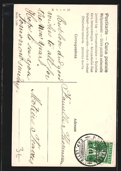Personenbezogene Daten auf der Rückseite der Karte wurden durch blauen Textmarker unkenntlich gemacht. Die blauen Stellen sind auf die Vorderseite durchgeweicht und wirken sich negativ auf das Postkartenfoto aus