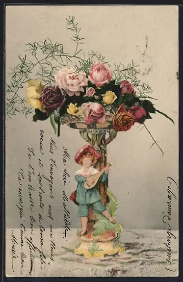 AK Kleiner Lautenspieler unter dem Rosenbouquet