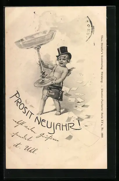 AK Kleiner Neujahrsengel mit riesigem Sektglas