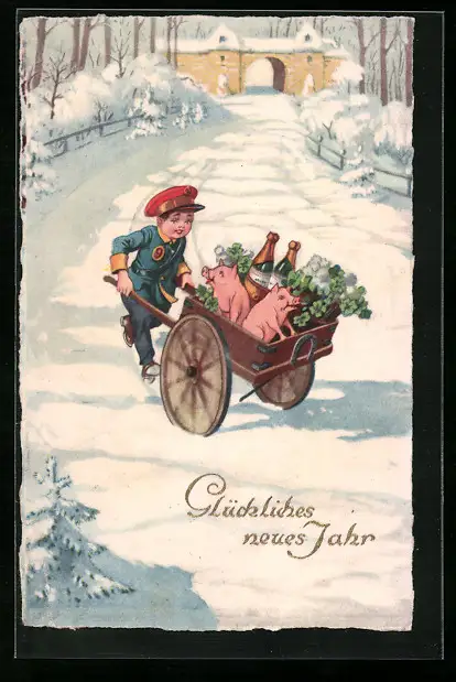 AK Kleiner Page mit Ferkeln und Sekt im Karren, Neujahrsgruss