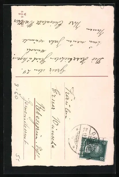 Personenbezogene Daten auf der Rückseite der Karte wurden durch blauen Textmarker unkenntlich gemacht. Die blauen Stellen sind auf die Vorderseite durchgeweicht und wirken sich negativ auf das Postkartenfoto aus