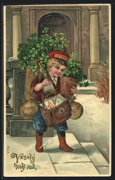 AK Kleiner Page mit Kleeblättern und Geldsäcken