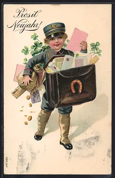 AK Kleiner Postbote mit einem Geldsack und Briefen, Neujahrsgruss