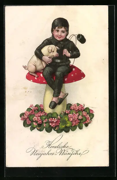 AK Kleiner Schornsteinfeger auf Fliegenpilz