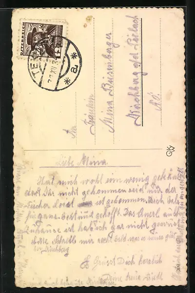 Personenbezogene Daten auf der Rückseite der Karte wurden durch blauen Textmarker unkenntlich gemacht. Die blauen Stellen sind auf die Vorderseite durchgeweicht und wirken sich negativ auf das Postkartenfoto aus
