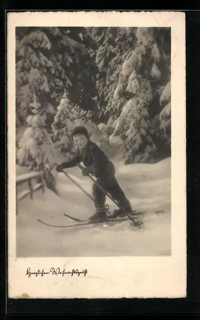 AK Kleiner Skiläufer vor schneebedeckten Tannen