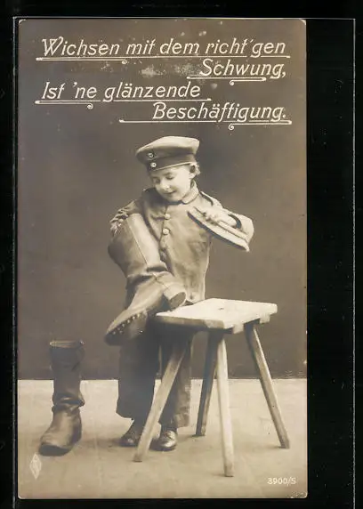 AK Kleiner Soldat in Uniform wichst einen Stiefel
