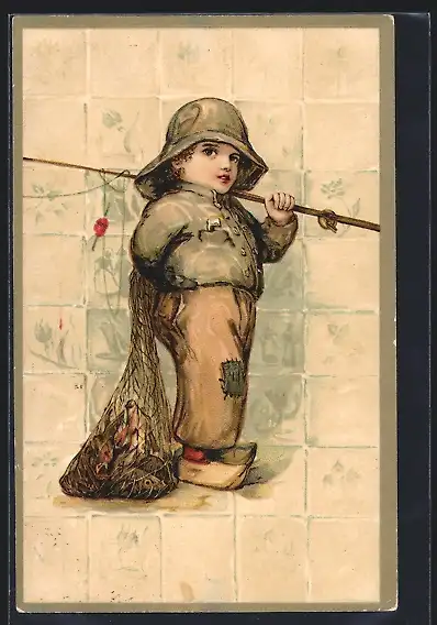 AK Kleiner niederländischer Fischer mit Fang vor Kacheln