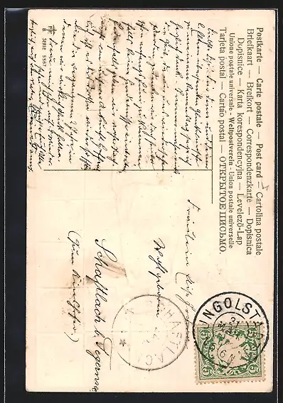Personenbezogene Daten auf der Rückseite der Karte wurden durch blauen Textmarker unkenntlich gemacht. Die blauen Stellen sind auf die Vorderseite durchgeweicht und wirken sich negativ auf das Postkartenfoto aus