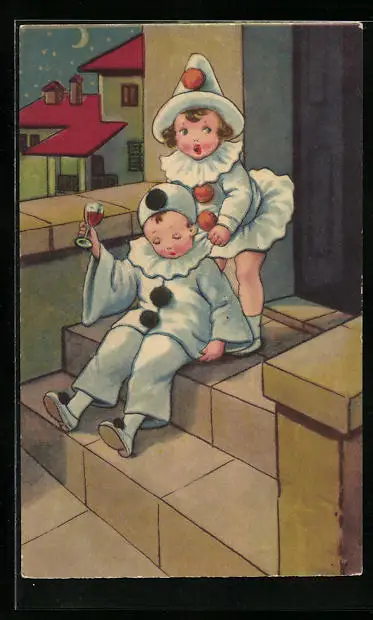 AK Kleines Harlekin-Mädchen und kleiner Harlekin-Junge mit Weinglas