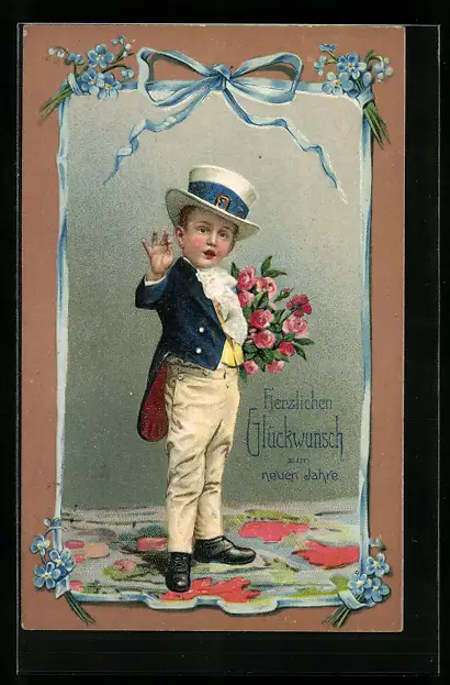 AK Kleines Kerlchen im Frack mit Rosenstrauss zu Neujahr