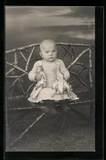AK Kleines Kind mit ernstem Blick und Puppe im Arm