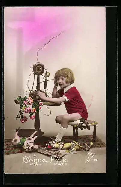 AK Kleines Mädchen am Telefon, Spielzeugpferd