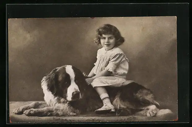 AK Kleines Mädchen auf dem Rücken eines liegenden Bernhardiners