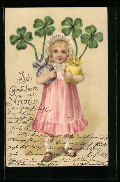 AK Kleines Mädchen im Kleid mit Kleeblättern