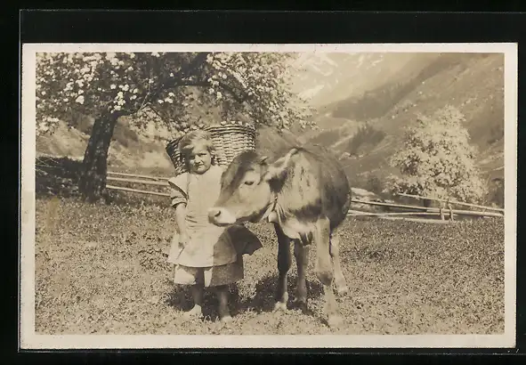 AK Kleines Mädchen mit Kuh auf einer Weide