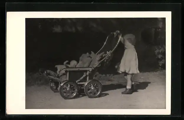 AK Kleines Mädchen mit Puppe im Kinderwagen
