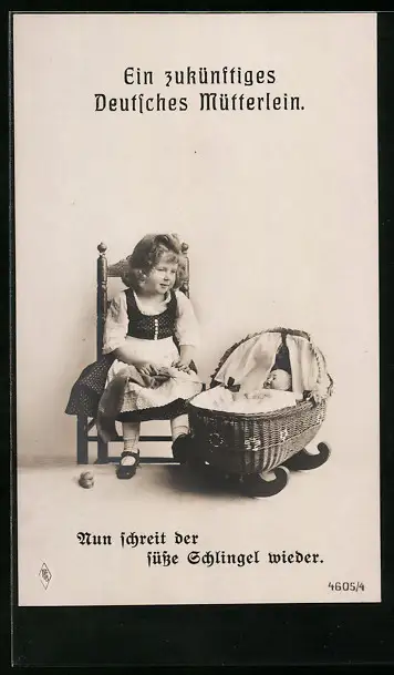 AK Kleines Mädchen mit Puppe im Puppenwagen