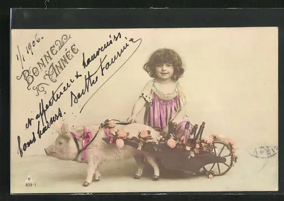 AK Kleines Mädchen mit Schweinekarren