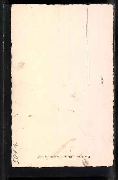 Personenbezogene Daten auf der Rückseite der Karte wurden durch blauen Textmarker unkenntlich gemacht. Die blauen Stellen sind auf die Vorderseite durchgeweicht und wirken sich negativ auf das Postkartenfoto aus