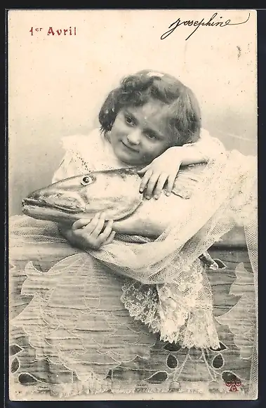 AK Kleines Mädchen mit riesigem Fisch, 1. April