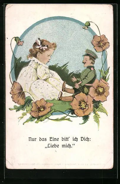 AK Kleines Mädchen redet mit ihrer Soldatenpuppe