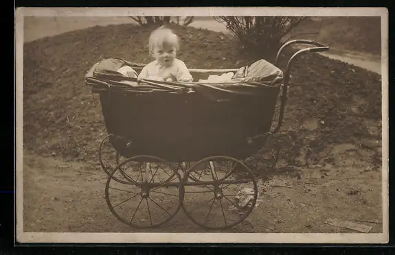 AK Kleines blondes Kind schaut neugierig aus ihrem Kinderwagen raus