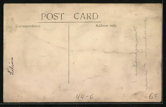 Personenbezogene Daten auf der Rückseite der Karte wurden durch blauen Textmarker unkenntlich gemacht. Die blauen Stellen sind auf die Vorderseite durchgeweicht und wirken sich negativ auf das Postkartenfoto aus