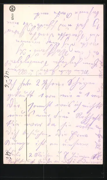 Personenbezogene Daten auf der Rückseite der Karte wurden durch blauen Textmarker unkenntlich gemacht. Die blauen Stellen sind auf die Vorderseite durchgeweicht und wirken sich negativ auf das Postkartenfoto aus