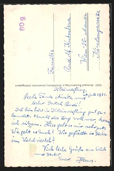 Personenbezogene Daten auf der Rückseite der Karte wurden durch blauen Textmarker unkenntlich gemacht. Die blauen Stellen sind auf die Vorderseite durchgeweicht und wirken sich negativ auf das Postkartenfoto aus