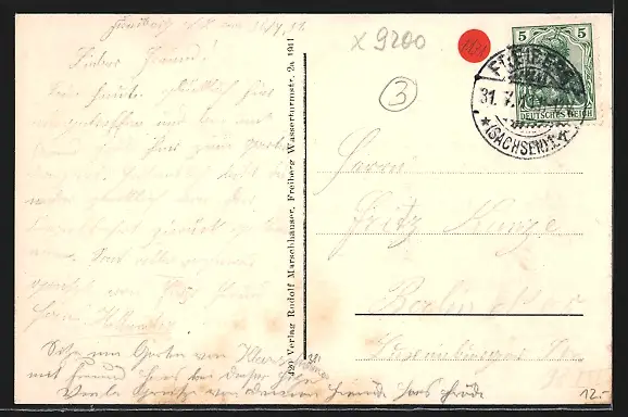 Personenbezogene Daten auf der Rückseite der Karte wurden durch blauen Textmarker unkenntlich gemacht. Die blauen Stellen sind auf die Vorderseite durchgeweicht und wirken sich negativ auf das Postkartenfoto aus