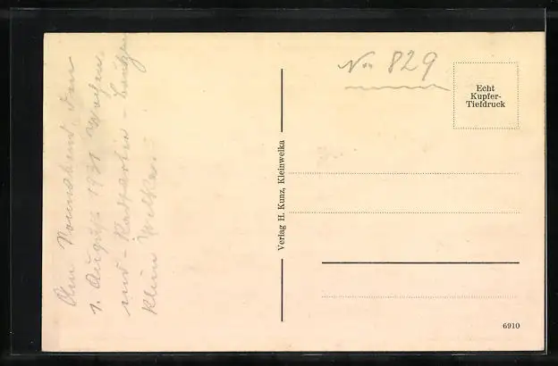Personenbezogene Daten auf der Rückseite der Karte wurden durch blauen Textmarker unkenntlich gemacht. Die blauen Stellen sind auf die Vorderseite durchgeweicht und wirken sich negativ auf das Postkartenfoto aus