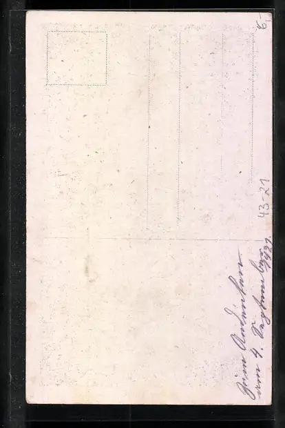 Personenbezogene Daten auf der Rückseite der Karte wurden durch blauen Textmarker unkenntlich gemacht. Die blauen Stellen sind auf die Vorderseite durchgeweicht und wirken sich negativ auf das Postkartenfoto aus