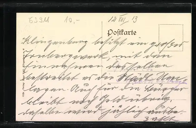 Personenbezogene Daten auf der Rückseite der Karte wurden durch blauen Textmarker unkenntlich gemacht. Die blauen Stellen sind auf die Vorderseite durchgeweicht und wirken sich negativ auf das Postkartenfoto aus